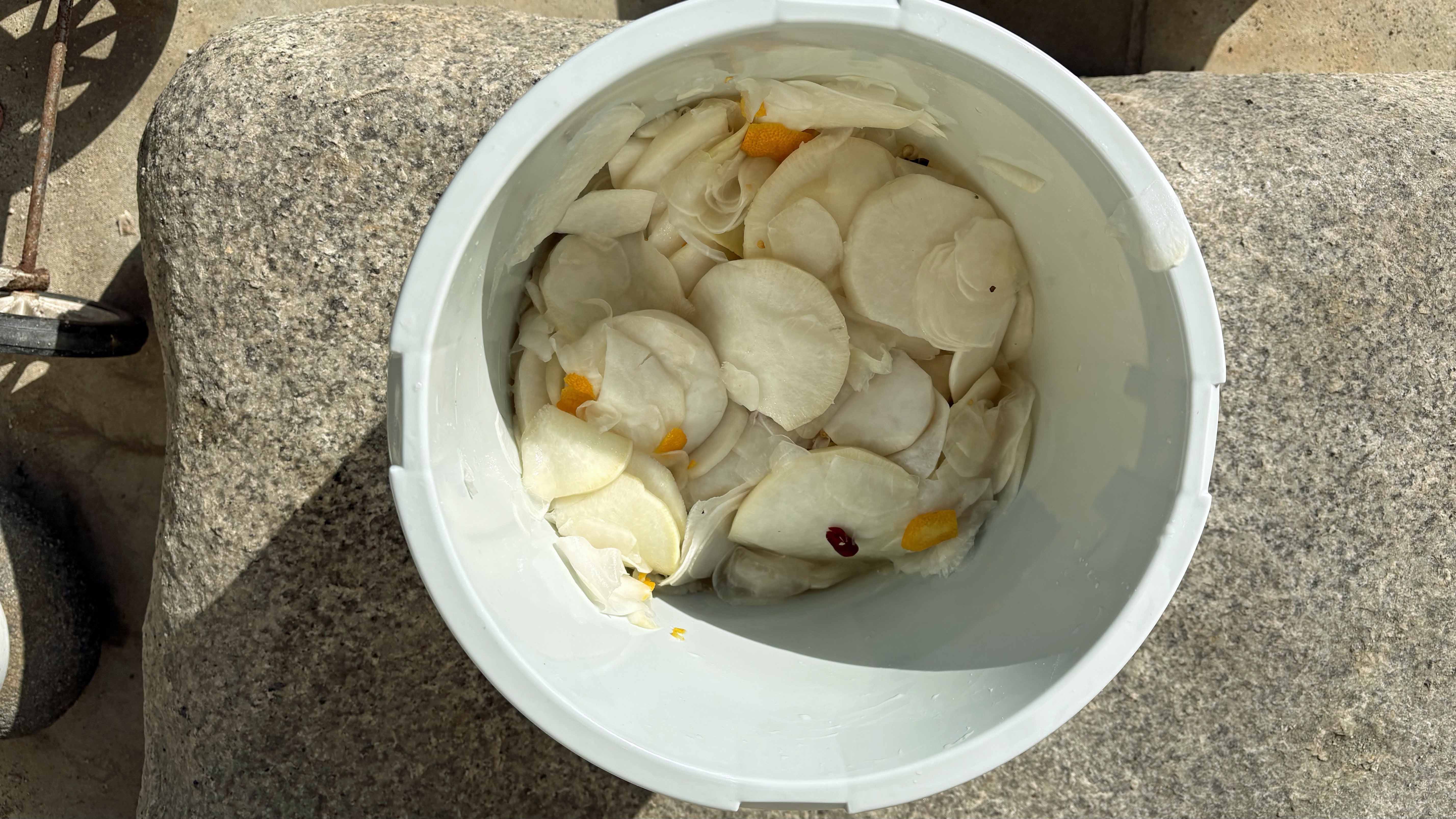 聖護院大根とカブラの両方を使いました。 聖護院大根は厚めに剥いたほうがよいでしょう。 約3.5kgを10ℓの樽に漬けました。 水を切って味付けをしました。 柚子を入れました。