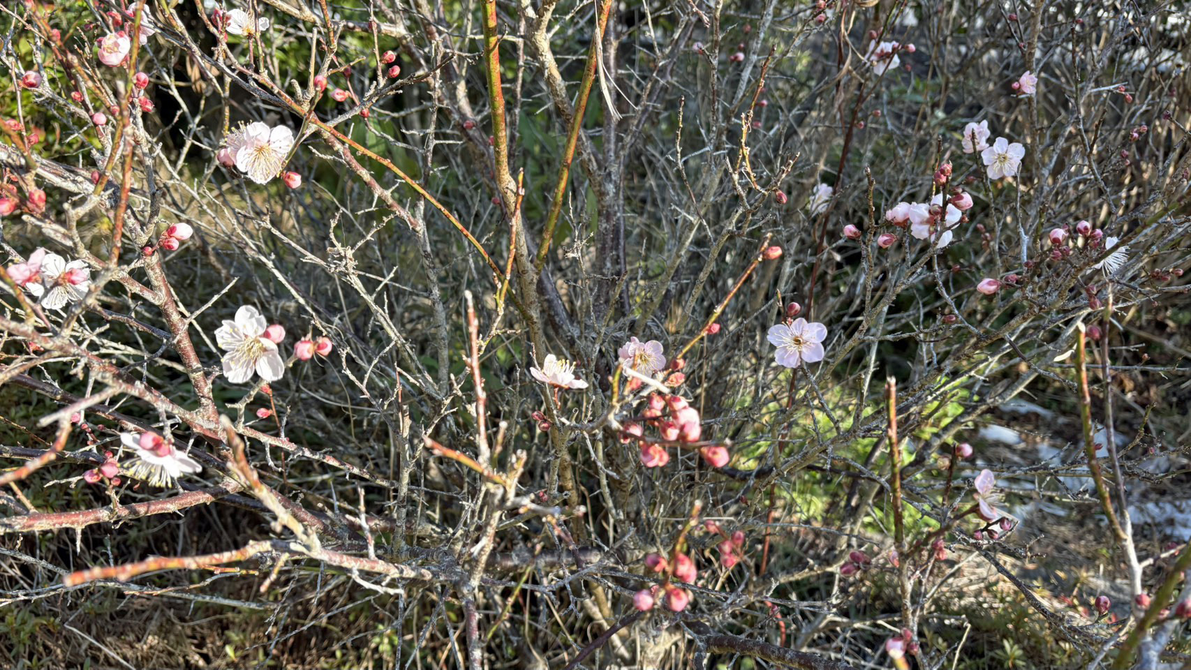 鑑賞用の梅が咲きました。 比較のために2020年1月25日の写真を載せてみました。 花の付き方は、例年と変わりがありません。 この木は60年以上になりますが、背丈はほとんど変わりません。 地植えで約1mぐらいです。 品種にもよりますが、紅梅の背丈は1.5m~4m程度です。 大きいものは5~10mに達することもあるようです。 花梅は野梅性・紅梅性・豊後性・杏性の4系統に分けられています。 これから盆梅展に出かけるときは、注意してみると楽しみも増えます。 野梅性には冬至梅、紅冬至、曙、八重寒紅、思いの儘(おもいのまま)、一重野梅など。 紅梅性には大盃、鹿児島紅、内裏、紅筆など。 豊後性には開運、越後獅子、黒田、白牡丹、未開紅、楊貴妃など。 杏性には江南無所、八朔などの品種があります。 個人的に昔から気になっているのが「思いのまま」です。 最初は変な名前だと思っていました。 名前の由来は二通りあります。 ①花色が”気まぐれ”に変わるから「気まぐれ説」 1本の木に紅・白・ピンク・絞り・まだらなど、複数の色が咲き分ける具合に変化します。 毎年一定ではなく、ある年は白ばかり、別の年はピンクばかりといった具合に変化します。 ②品種改良をしても色が”思いのままにならない”から「園芸家泣かせ説」 園芸家が品種改良をしても花色が狙った通りにならず”思いのまま”に咲いてしまう。