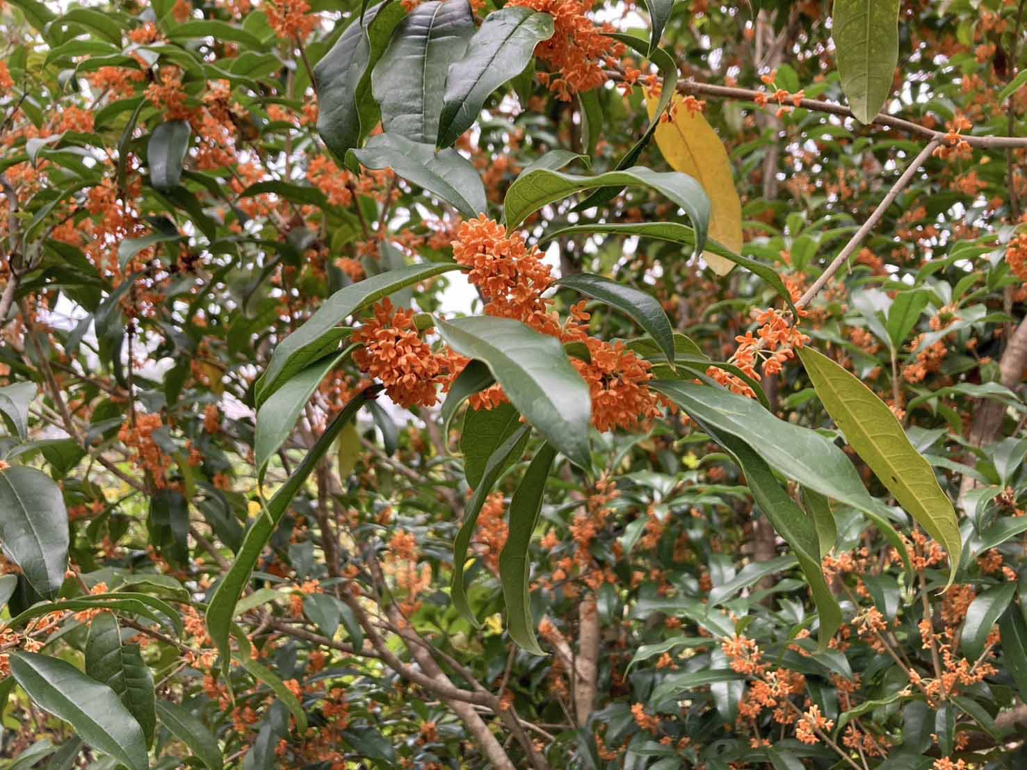 今頃の季節になると香りがきついのが金木犀(キンモクセイ)である。 気になるのはなぜ実がならないのか? キンモクセイは雌雄異株(しゆういしゅ)で、雄株と雌株が別々に存在する植物である。 日本では花の香りを楽しむ目的で導入されたため、花付が良い雄株のみが選ばれて普及したという歴史的背景がある。 当然ながら受粉が起こらず、実がならない。 原産地の中国では雌株も存在するので紫色の実がなることがあるそうである。 キンモクセイに似たギンモクセイがあるが、違いはギンモクセイが原種に近く、キンモクセイはギンモクセイの変種である。