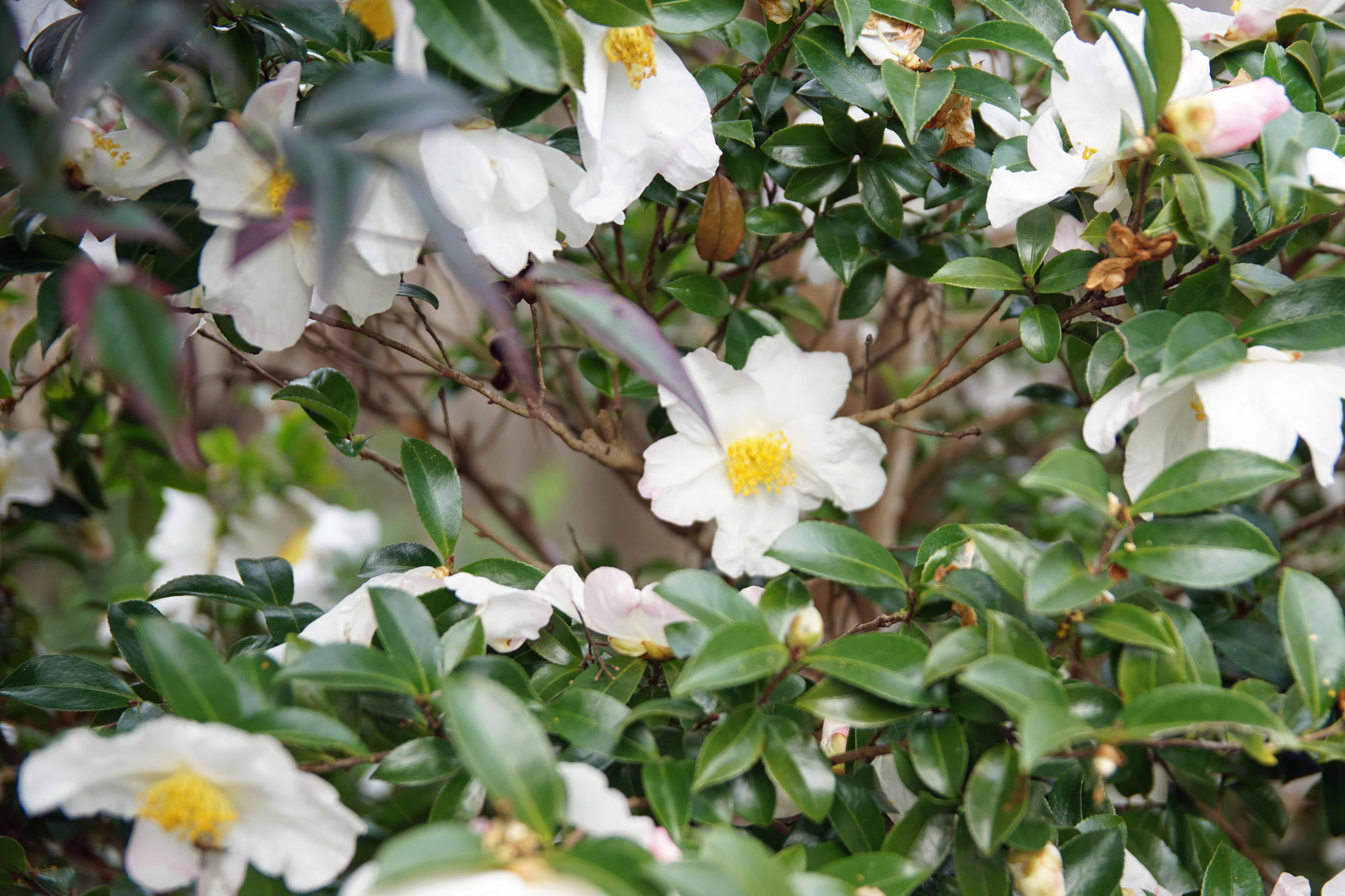 サザンカが咲き始めました。 季節は晩秋になっています。 ツバキ科の植物は熱帯から亜熱帯に自生していて、ツバキ、サザンカ、チャは温帯に適応した品種である。 サザンカは冬の季語にされるが、寒さに強いわけではなく開花時期に寒気にさらされると花が落ちることもあるようだ。 品種改良された園芸種には寒さに強く、真冬でも花を咲かせる品種が多い。 原種は白い一重咲きが基本で、四国・九州・沖縄など暖地に咲く。