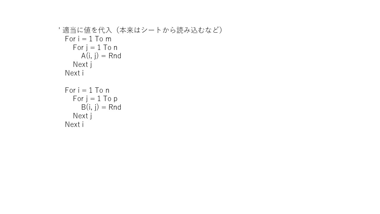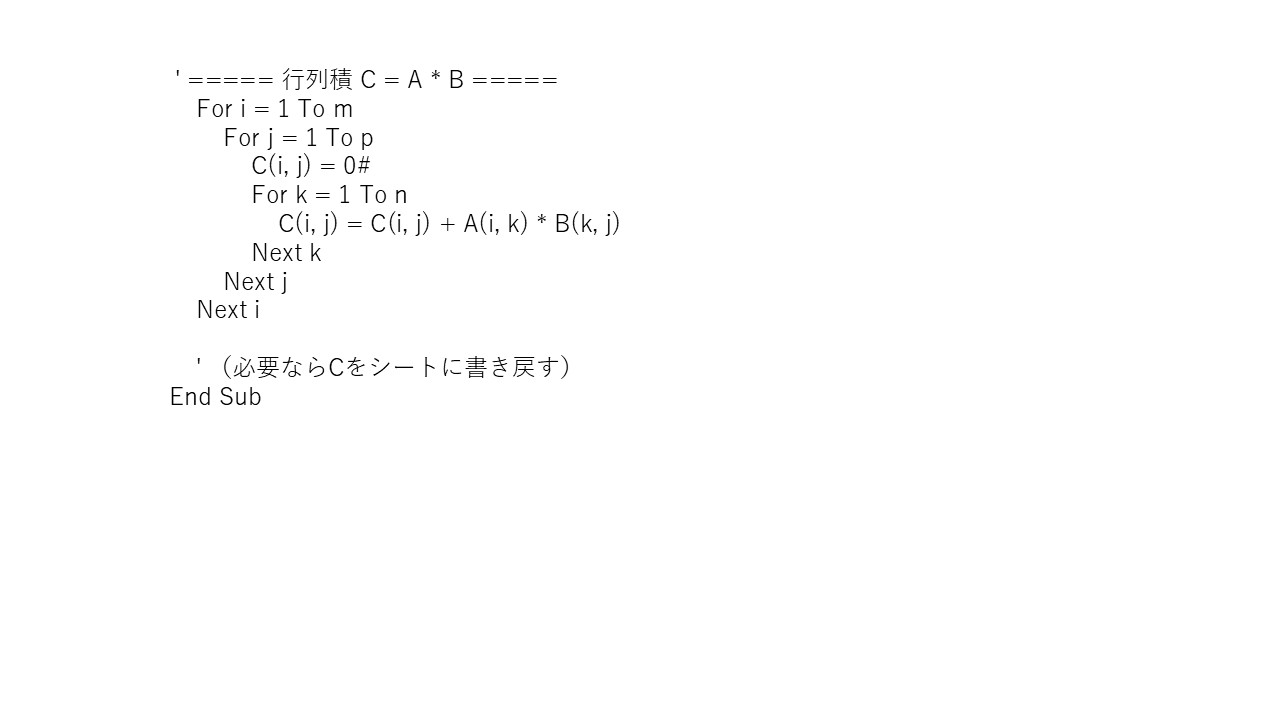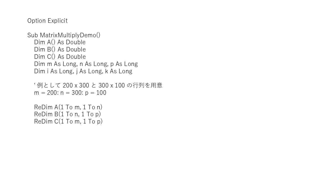 行列演算をVBAでコーディングした例 このような計算を複数のGPUで並列しておこなうのである。 他にはExcelでMMULTをVBAで呼ぶという手もある MMULTはVariant配列で受け渡しをする