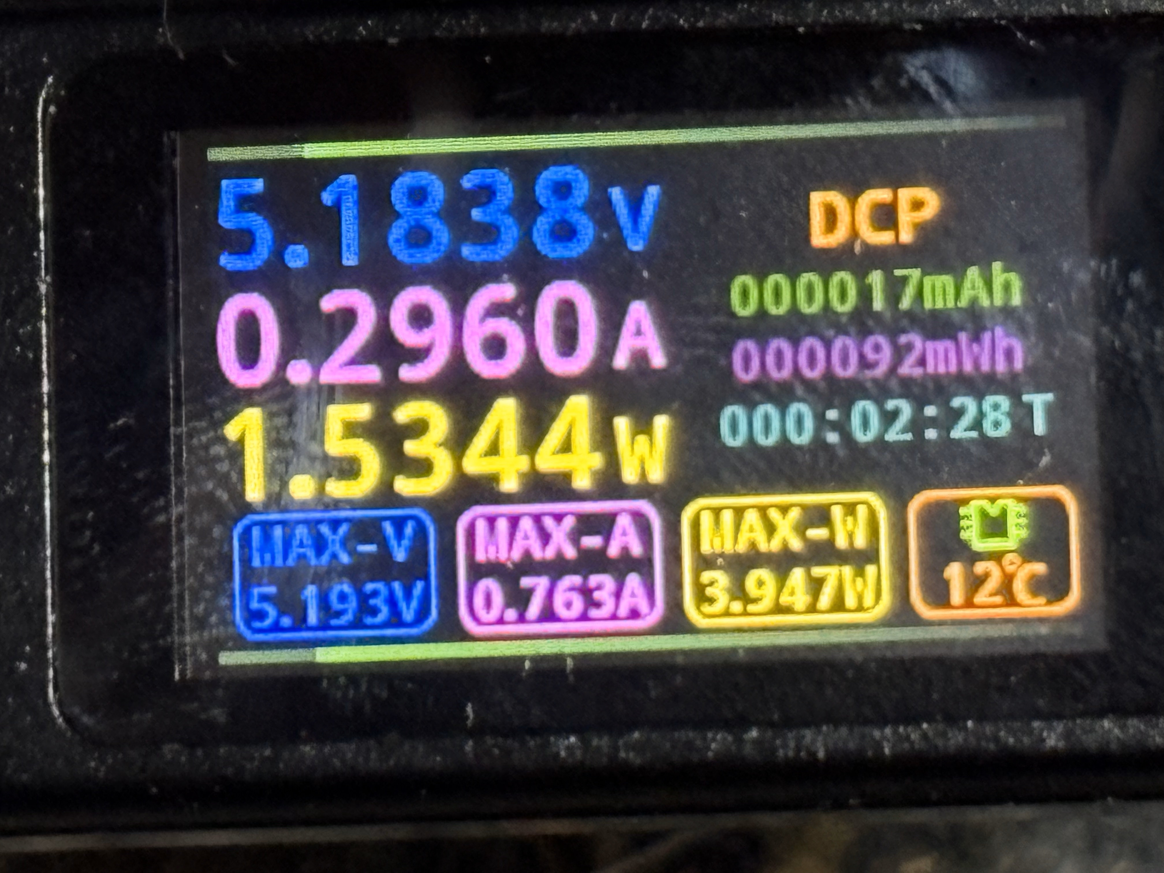USBテスターを取り寄せました。 例として充電器とUSB機器の間にUSBテスターを挟みます。 電圧は通常5V前後です。 USB PD(USB Power Delivery)対応なら最大20~30Vまで測定可能です。USB PDとはUSB Type-c端子を使った大容量の電力供給規格のことです。 この機種は最大40Vまで測定可能です。 電流は0.2960A流れています。 最大は16Aまで測定可能です。1.5344Wは累積電力量(mAh/Wh)です。 テスターはケーブルの品質確認、規格判別に使います。 ケーブルの品質管理では、内部の配線が正しくつながっているかLEDで表示されます。 断線や不良ケーブルを一発で判定可能です。 規格判別ではUSB2.0/3.0/3.2、Thunderbolt,PD対応などを見分けられます。 USB-Cのケーブルが増えてくると見た目だけではわかりません。 テスターで確認すると安心です。 このUSBテスターはType-Cしか対応していません。 Type-Aは変換アダプターを使いますが、取り寄せ中で確かめていません。 右の上に「DCP」と表示されていますが、「Dedicate Charging Port(専用充電ポート)」の略で、Dedicate Vharging Port規格(BC1.2)に定義された充電専用のポートを指します。データ通信はできず、充電の為だけに使われるポートです。 追記:商品によってはUSB Type-AとType-Cの両方使えるものもあります。 基本的にUSB Type-Aは5Vです。 USB 2.0:最大2.5W(5V・0.5A)、 3.X:最大4.5W(5V/0.9A)) USB 2.0以前とUSB3.0以降は区別するために意図的に青色にしている場合が多いようです。 データ転送でUSB3.0以降を使うと問題が起きる場合はUSB 2.0を使うと問題が改善される場合があります。 USB1.0は白色、USB2.0は黒色の商品が多いですが100%でもないようです。 USB 4.0という商品もありますが、これからはUSB-Cに移行するものと思われます。 iPhoneを使っていますが、iPhone16はUSB-CでiPhone SEはUSB Type-Aなので充電器は別々になります。 最近は付属品ではないので別売を買います。 純正を買う必要はありません。 例えばiPhone16の充電器は20W以上あればよい。 MagSafe充電は30W以上の充電器が推奨されています。 AUKEYの40Wを買いましたが、バッテリーの充電には良いのですが、iPhone16には警告が表示されて充電できませんでした。USB-Cだから大容量が良いというわけでもありません。 充電時間は遅いですが20Wが安心です。 用途によって使い分けることになります。 20Wなら安ければ1000円台であります。 Type-A から Type-Cのケーブルを使えば今までのType-Aの充電器が使えます。